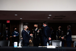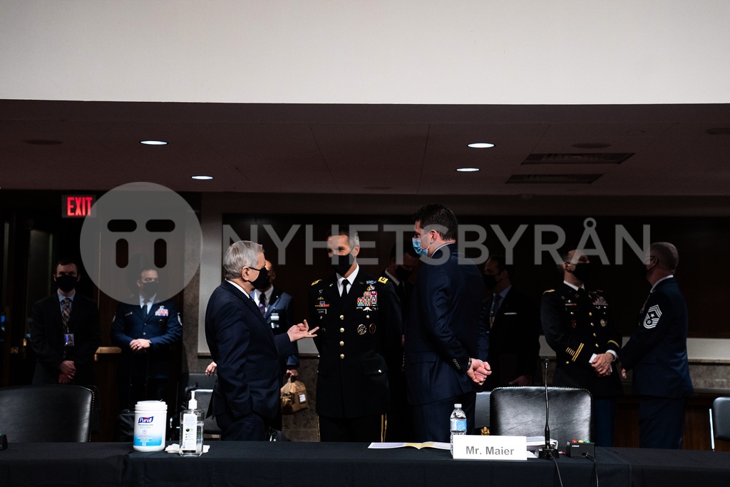 United States Senator Jack Reed (Democrat of Rhode Island), Chairman, US Senate Committee on Armed Services, and US Senator James Inhofe (Republican of Oklahoma), Ranking Member, US Senate Committee on Armed Services, speak to one another before a hearing on the United States Special Operations Command and United States Cyber Command with the Senate Armed Services Committee on Capitol Hill in Washington DC on March 25th, 2021. Credit: Anna Moneymaker / Pool via CNP. 25 Mar 2021 Pictured: United States Senator Jack Reed (Democrat of Rhode Island), Chairman, US Senate Committee on Armed Services, greets General Richard D. Clarke, USA, Commander, United States Special Operations Command, center, and Christopher P. Maier, Acting Assistant Secretary Of Defense For Special Operations And Low-Intensity Conflict, right, before the start of a hearing on the United States Special Operations Command and United States Cyber Command with the Senate Armed Services Committee on Capitol Hill in Washington DC on March 25th, 2021. Credit: Anna Moneymaker / Pool via CNP. Photo credit: Anna Moneymaker - Pool via CNP / MEGA TheMegaAgency.com +1 888 505 6342