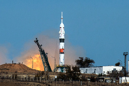 2020-10-14 KYZYLORDA REGION, KAZAKHSTAN - OCTOBER 14, 2020: The Soyuz-2.1a rocket booster with the Soyuz MS-17 spacecraft blasts off to the International Space Station (ISS) from Baikonur Cosmodrome. The Soyuz MS-17 mission is the first to use the ultra-fast two-orbit flight plan; the crew is scheduled to arrive at the ISS in about 3 hours and dock to the Rassvet docking port at 11:52 Moscow Time. The Soyuz MS-17 spacecraft is carrying Expedition 64 crew members, NASA astronaut Kate Rubins, Roscosmos cosmonauts Sergey Kud-Sverchkov and Sergey Ryzhikov; they are to be welcomed by Roscosmos cosmonauts Anatoly Ivanishin, Ivan Vagner, and NASA astronaut Christopher Cassidy of the ISS Expedition 63. Roscosmos Press Office/TASS Foto Roscosmos Press Office / ITAR-TASS / TT / kod 225 ref: ***BETALBILD*** OBS Bilden kommer från den statliga ryska nyhetsbyrån Itar-Tass