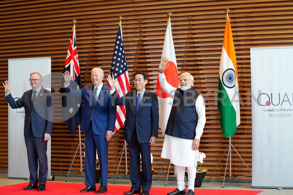 Leaders of Quadrilateral Security Dialogue (Quad) from left to right, Australian Prime Minister Anthony Albanese, U.S. President Joe Biden, Japanese Prime Minister Fumio Kishida, and Indian Prime Minister Narendra Modi, pose for photo at the entrance hall of the Prime Minister's Office of Japan in Tokyo, Japan, Tuesday, May 24, 2022. Leaders of the U.S., Japan, Australia and India gathered in Tokyo on Tuesday for a summit of the “Quad.” (Zhang Xiaoyu/Pool Photo via AP) TKSJ309