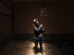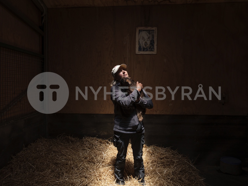 Portrait of Pam Ahern, founder and director of Edgar's Mission, a sanctuary of rescued farm animals. A portrait of Edgar Alan Pig, the animal who was the catalyst for Pam starting the sanctuary, hangs on the wall of the pen behind. Photographed by Alana Holmberg / Oculi for The Guardian. © Guardian Australia / eyevine Contact eyevine for more information about using this image: T: +44 (0) 20 8709 8709 E: info@eyevine.com http://www.eyevine.com