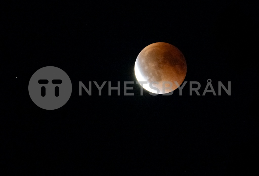 Blodmånen norr om Åhus på söndagskvällen. Söndagskvällens månförmörkelse kämpade initialt med med dis och moln på den skånska östkusten, innan den nådde en bit upp på himlavalvet vid halvniotiden.
