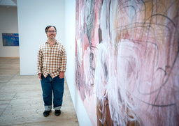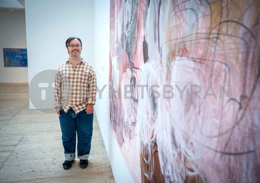 MALMÖ 2025-09-11 Mattias Johansson framför ett av sina verk i utställningen ’Speaking Volumes’ på Malmö konsthall på torsdagen. På torsdagen pressvisades utställningen med verk från sex konstnärer från USA, Storbritannien och Sverige. – Speaking Volumes utmanar normen för vad konstnärlig kvalitet är, och vem som kan uppnå den. – Utställningen lyfter fram sex individer som i ordets sannaste bemärkelse är konstnärer. Samtidigt synliggör den de strukturer och system som alltid utgår från den funktionsfullkomliga kroppen – strukturer som de flesta av oss lever i och bidrar till, medvetet eller omedvetet, säger utställningens curator Lucy Smalley på Malmö Konsthall i ett pressmeddelande. Foto: Johan Nilsson / TT / Kod 50090