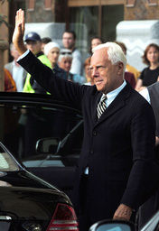 Italian fashion designer Giorgio Armani waves as he heads to the wedding of Italian actress Sophia Loren's son Carlo Ponti jr. and Hungarian violinist Andrea Meszaros in Budapest, Hungary, on Saturday, Sept. 18, 2004. The wedding ceremony takes place at Budapest's Szent Istvan, or St. Stephen, Basilica where the Ponti family expects prominent celebrity guests from the movie and music business. (AP Photo/Gabriella Szabo)