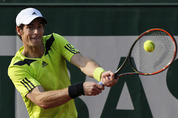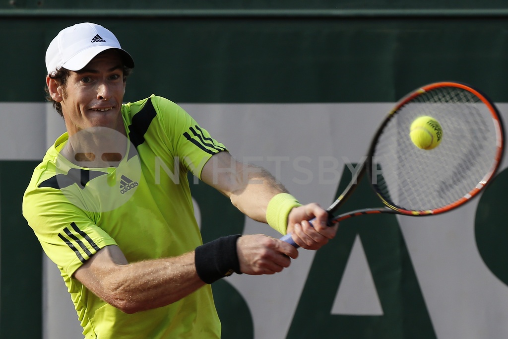 Britain's Andy Murray returns the ball during the fourth round match of the French Open tennis tournament against Spain's Fernando Verdasco at the Roland Garros stadium, in Paris, France, Monday, June 2, 2014. Murray won in three sets 6-4, 7-5, 7-6. (AP Photo/Michel Euler)