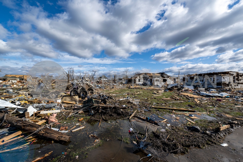 Damage from a late-night tornado is seen in Sullivan, Ind., Saturday, April 1, 2023. Multiple deaths were reported in the area following the storm. (AP Photo/Doug McSchooler) INDM105