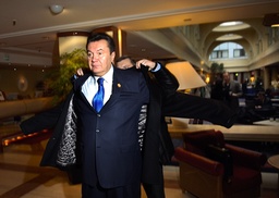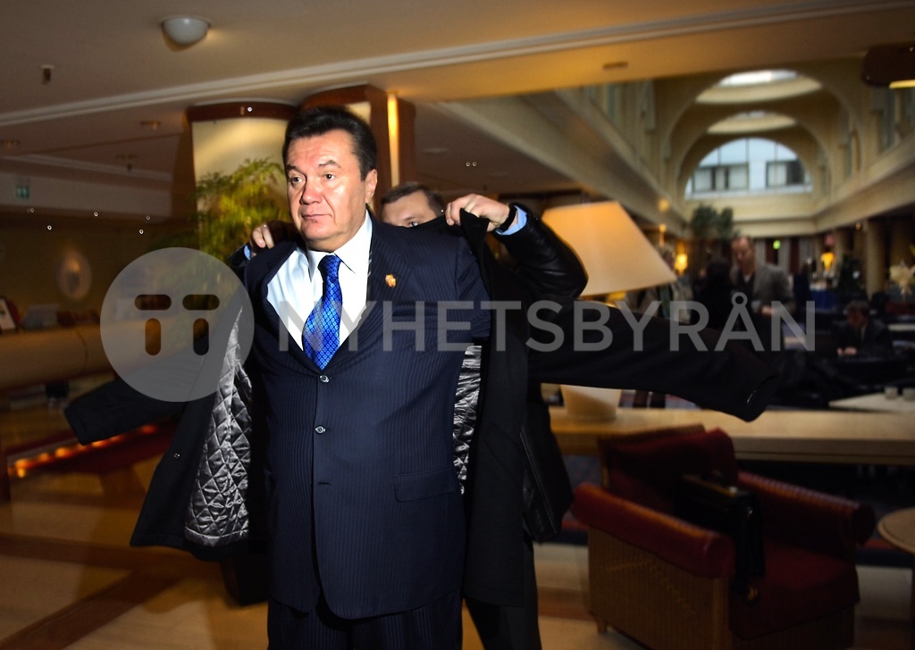 STOCKHOLM 20051115 Viktor JANUKOVITJ, Ukrainas f d president före den oranga revolutionen får hjälp av en livvakt med rockpåtagning inför fotograferingen. Foto Björn Larsson Ask / SvD / SCANPIX Code 30092
