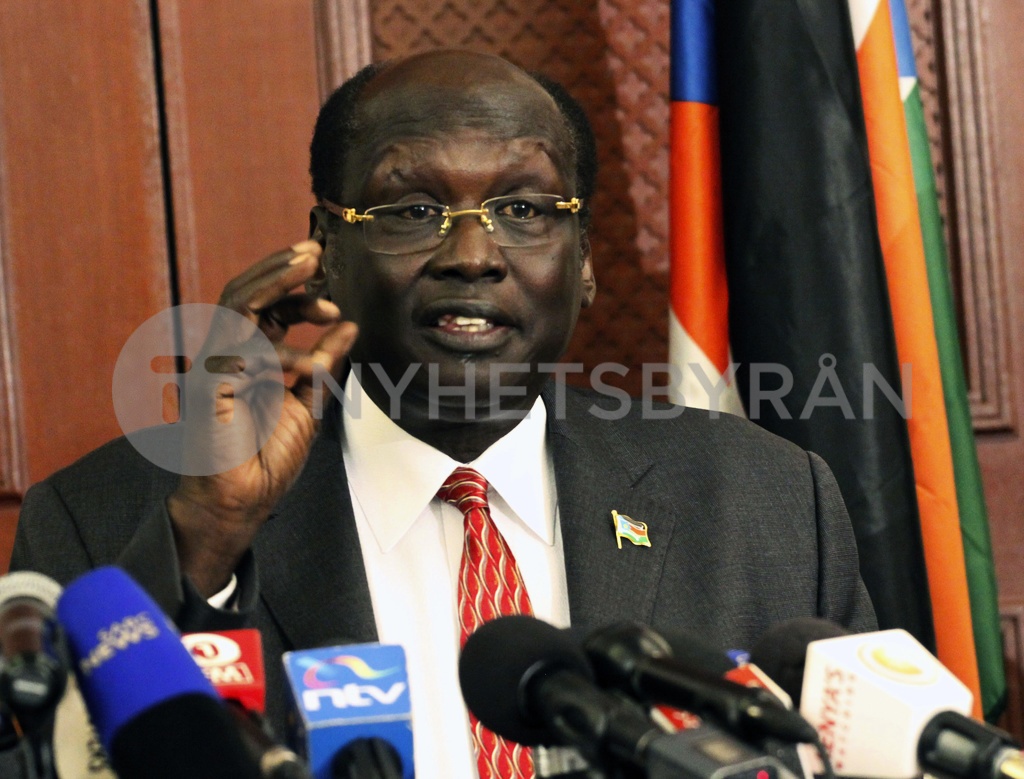 South Sudan Minister of Information, Barnaba Marial Benjamin speaks to journalists in Nairobi, Kenya, Monday, April 2, 2012. The government of South Sudan says it is not satisfied with the mediation role of the African Union in resolving its disputes with Sudan. South Sudan Government spokesman Barnaba said Monday that South Sudan is disappointed by a report by the AU to the U.N. Security Council that he said portrayed South Sudan as the aggressor in the hostilities between the two countries. (AP Photo/Khalil Senosi)