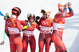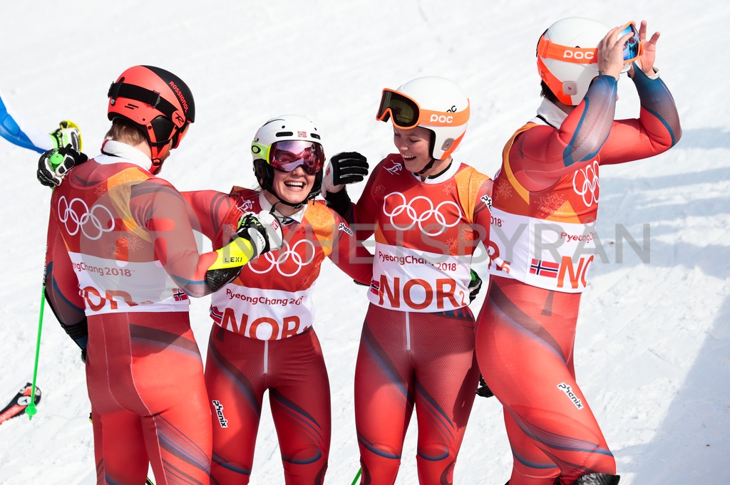 Pyeongchang, Sør-Korea 20180224. Leif Kristian Nestvold-Haugen f.v., Kristin Lysdahl, Nina Haver-Løseth og Sebastian Foss-Solevåg jubler etter at de sikret seg bronsjemedalje under lagkonkurranse parallellslalåm i Yongpyong Alpine Centre under vinter-OL i Pyeongchang. Foto: Lise Åserud / NTB