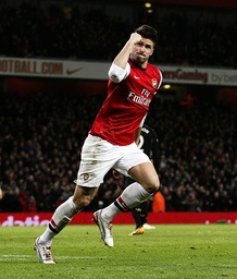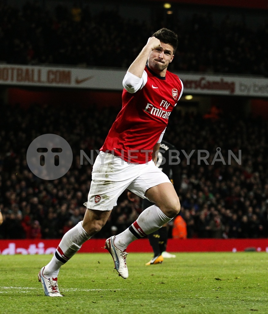 epa03562106 Olivier Giroud of Arsenal celebrates after scoring against Liverpool during the English Premier League soccer match between Arsenal and Liverpool at the Emirates Stadium, London, Britain, 30 January 2013. EPA/KERIM OKTEN DataCo terms and conditions apply. http//www.epa.eu/downloads/DataCo-TCs.pdf