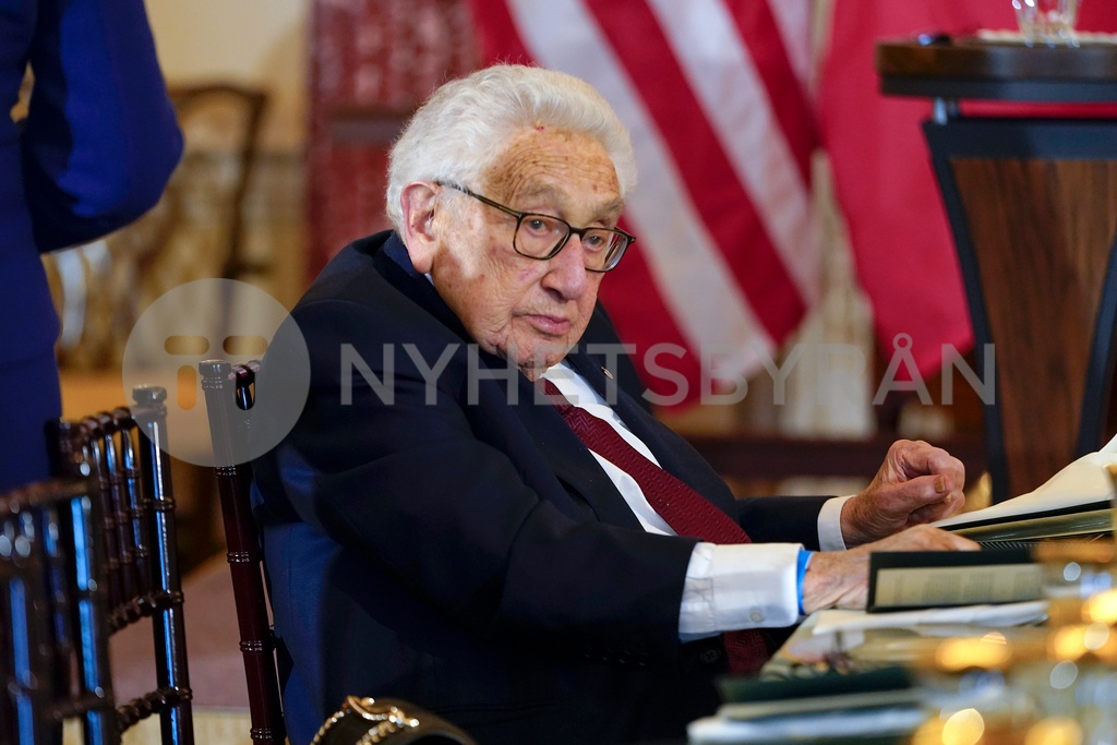 FILE - Former U.S. Secretary of State Henry Kissinger attends a luncheon with French President Emmanuel Macron, Vice President Kamala Harris and Secretary of State Antony Blinken, Thursday, Dec. 1, 2022, at the State Department in Washington. Kissinger marks his 100th birthday on Saturday, May 27, 2023, outlasting many of his political contemporaries who guided the United States through one of its most tumultuous periods including the presidency of Richard Nixon and the Vietnam War. (AP Photo/Jacquelyn Martin, File) NY132