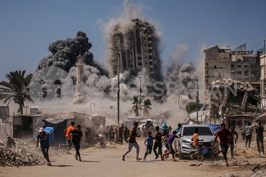 Palestinians run for cover during an Israeli airstrike on a high-rise building in Gaza City, Friday, Sept. 5, 2025, after the Israeli army issued a prior warning. (AP Photo/Yousef Al Zanoun) XOB101