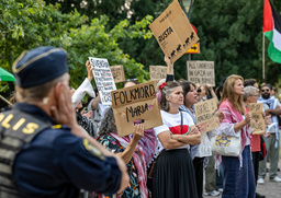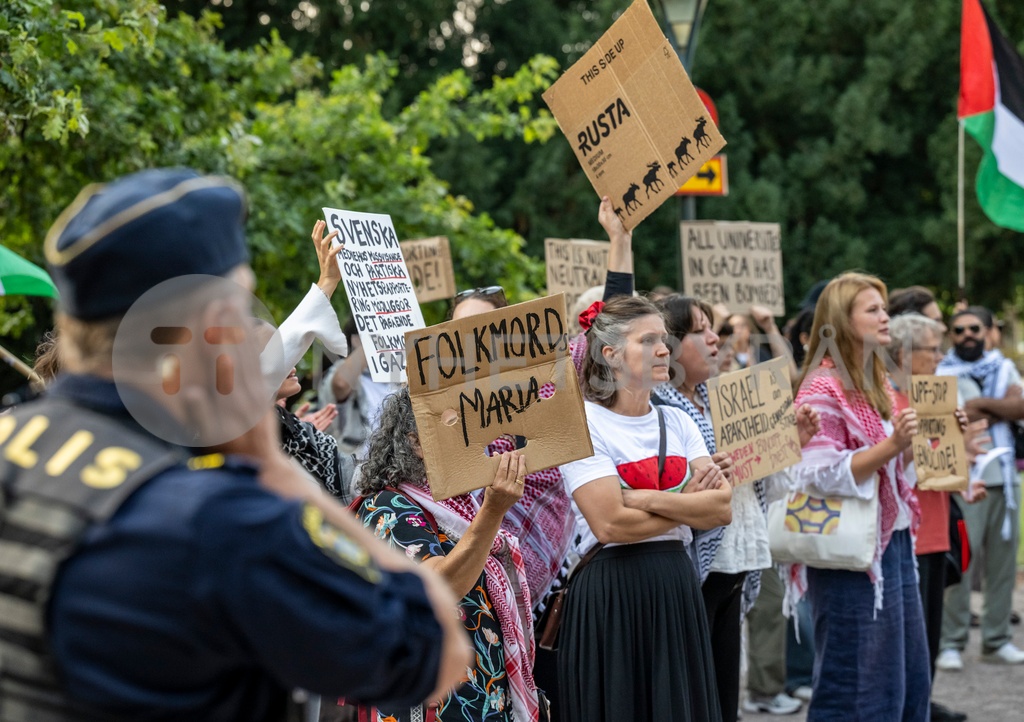 LUND 2025-09-01 Demonstranter utanför Akademiska Föreningens hus där utrikesministern besökte Utrikespolitiska Föreningen i Lund på måndagen. Foto: Johan Nilsson / TT / Kod 50090