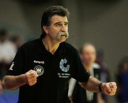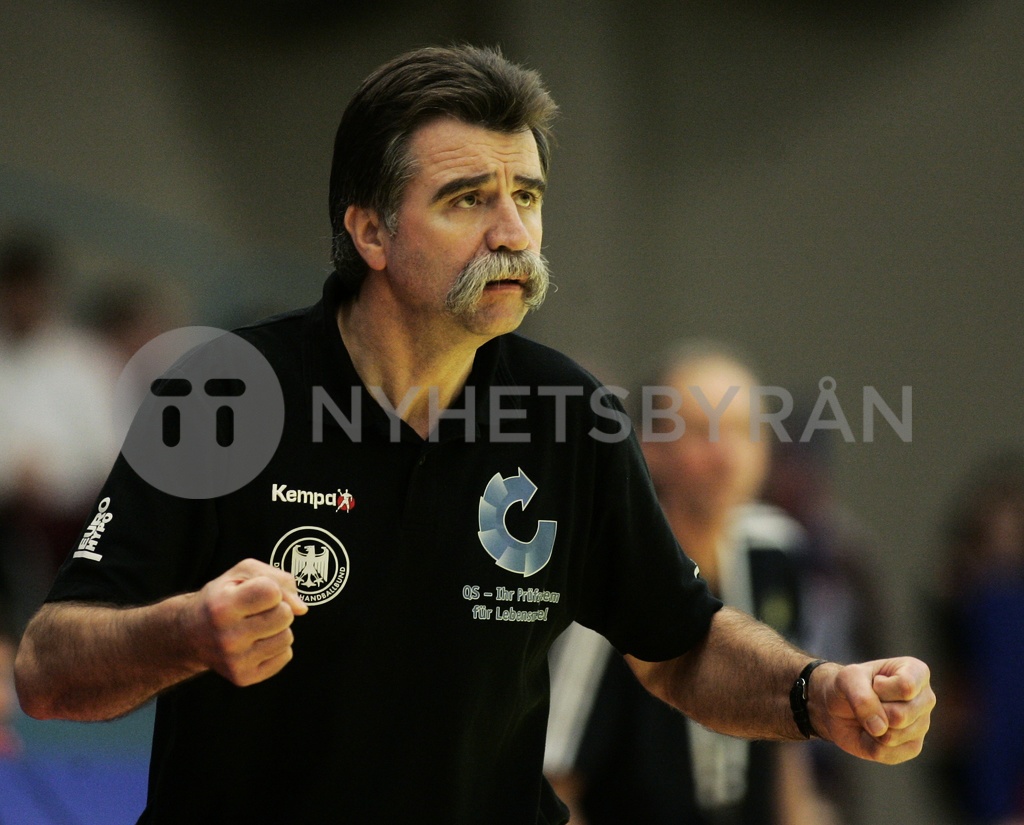 German handball coach Heiner Brand reacts during the group two match of the 8th Men's European Handball Championship between Germany and Sweden in the Spektrum hall in Trondheim, Norway, on Thursday, Jan. 24, 2008. Germany won the match 31-29. (AP Photo/Christof Stache)