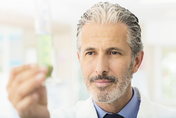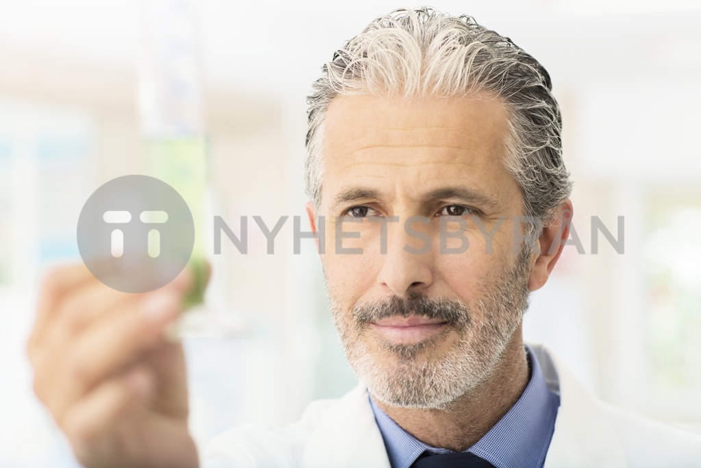 Scientist examining green liquid in tube