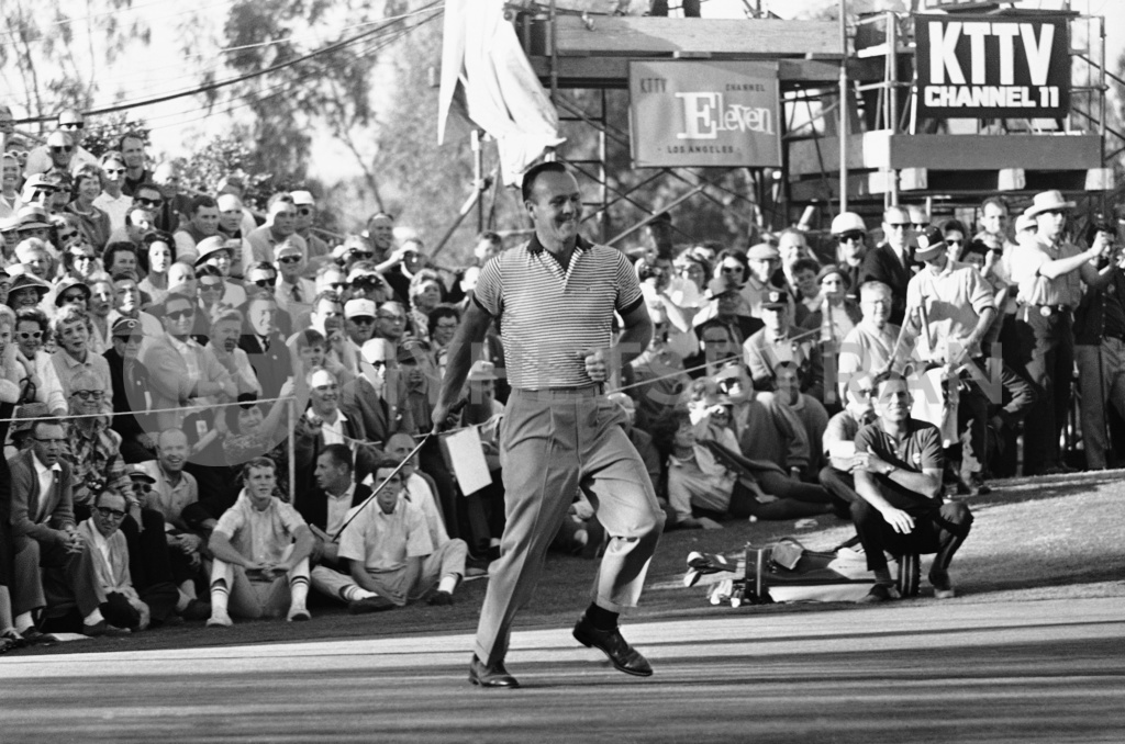 Arnold Palmer, with a grin on his face, center, strides across the 18th green with nothing left to do but tap the ball into the cup for first place in the Los Angeles Open golf tourney, Jan. 8, 1963, Los Angeles, Calif. Palmer had just putted, with the ball stopping inches from the cup. He tapped it in to card a 5 under-par 66 in the final round. The title, which eluded Palmer in seven previous attempts, didnt get away because the 66 on the final day gave him a 72-hole total of 274 and the $9,000 check which goes to the winner. (AP Photo)