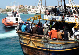 Refugees who flew Libya arrive on a boat on the Italian island of Lampedusa on April 19, 2011. 760 people were aboard a 20-meter boat arriving from Libya. AFP PHOTO / Mauro Seminara