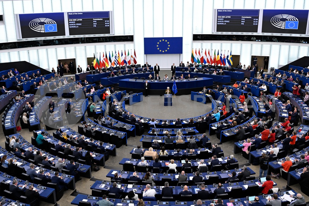 European Commission President Ursula von der Leyen gestures as she delivers a major state of the union speech at the European Parliament in Strasbourg, eastern France, Wednesday, Sept. 10, 2025. (AP Photo/Pascal Bastien) MEU108