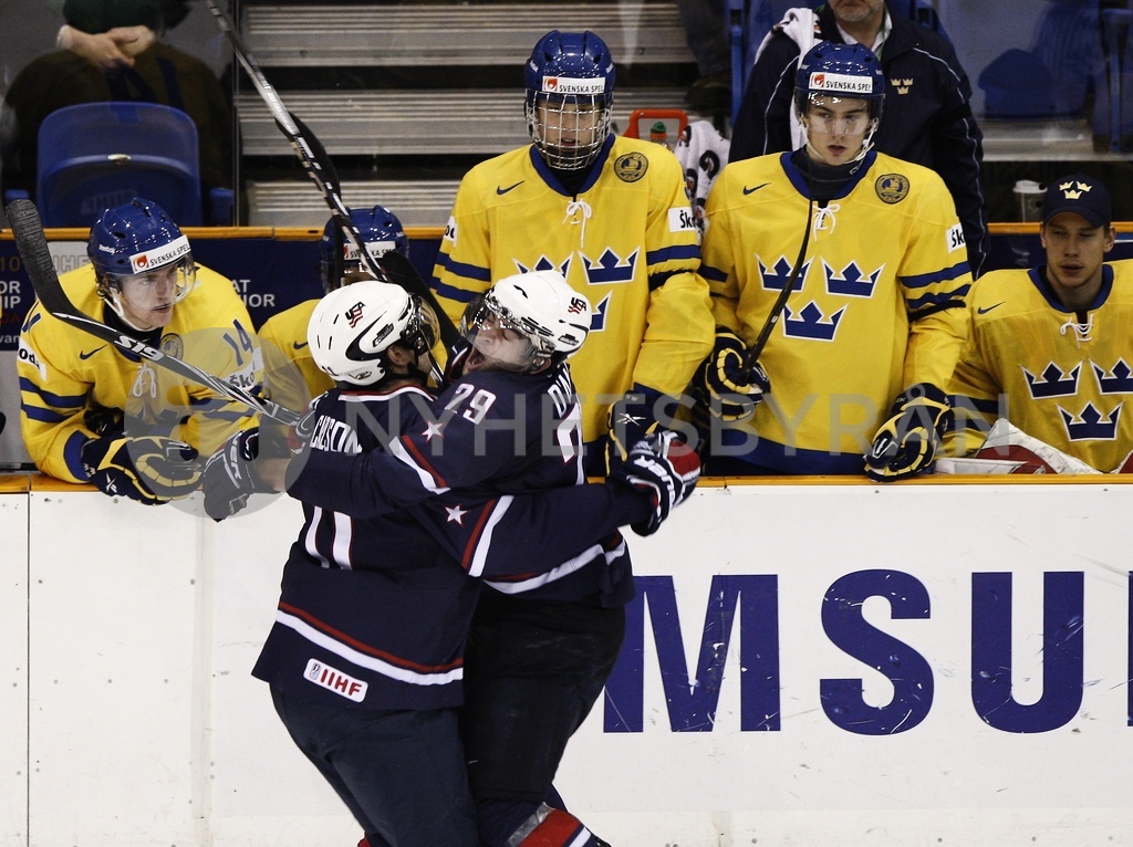 Team USA forward Jerry D'Amigo, right, celebrates his goal with teammate John Carlson, left, as Team Sweden players watches from their bench during the third period of a semifinal in the world junior hockey championships Sunday, Jan. 3, 2010, in Saskatoon, Saskatchewan, Canada. (AP Photo/The Canadian Press, Geoff Howe)