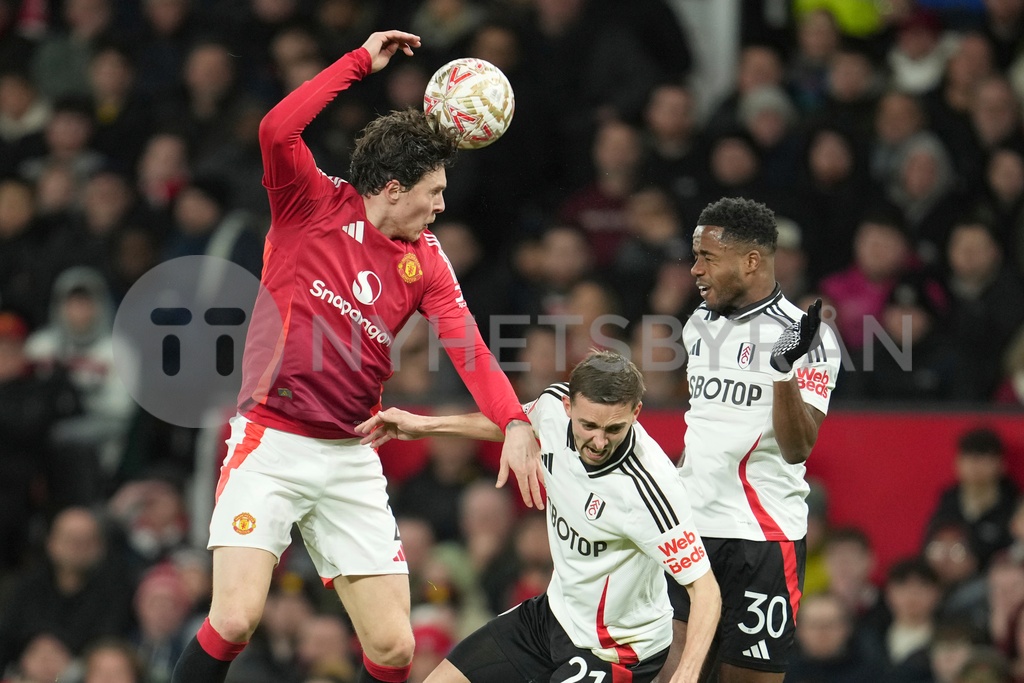 Manchester United's Victor Lindelof, left, challenges for the ball with Fulham's Timothy Castagne, centre, and Fulham's Ryan Sessegnon during the English FA Cup soccer match between Manchester United and Fulham at the Old Trafford stadium in Manchester, England, Sunday, March 2, 2025. (AP Photo/Jon Super) XSG237