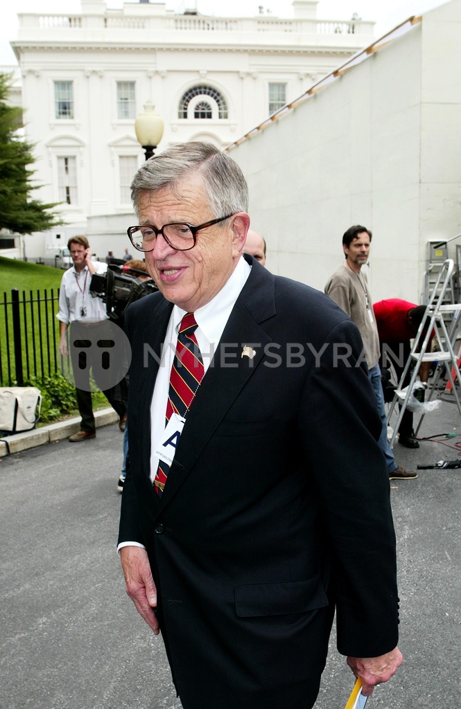 Former Nixon Administration senior staff member and Watergate figure Chuck Colson walks outside of the White House following a roundtable discussion with U.S. President George W. Bush, in Washington in this June 18, 2003, file photo. Colson died on Saturday at age 80, the ministry said. REUTERS/Larry Downing/Files (UNITED STATES - Tags: POLITICS OBITUARY)