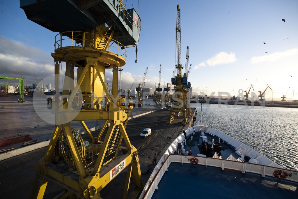 Dock Yards, crane, industry, Ship Clipper Adventurer, entering port, evening. Casablanca, Port Of Casablanca, Morocco