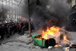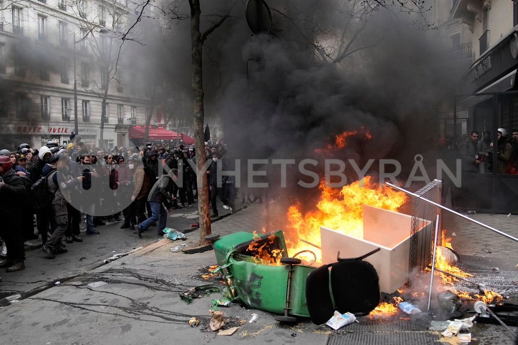 Demonstrators watch burning garbage cans during a demonstration Tuesday, March 28, 2023 in Paris. It's the latest round of nationwide demonstrations and strikes against unpopular pension reforms and President Emmanuel Macron's push to raise France's legal retirement age from 62 to 64. (AP Photo/Christophe Ena) PAR156