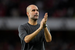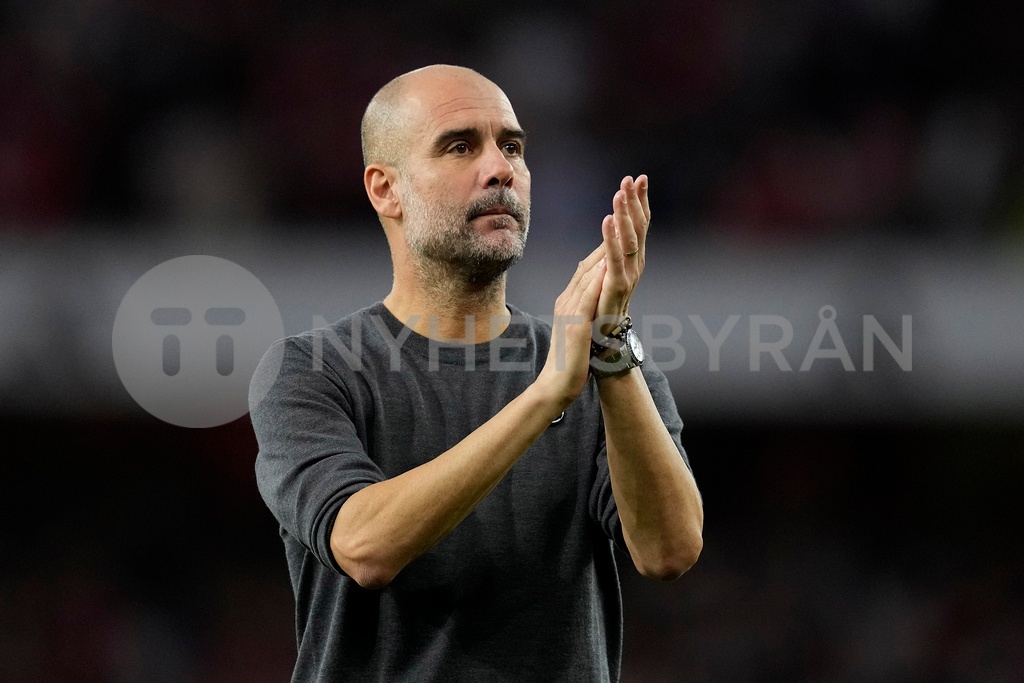 Manchester City's head coach Pep Guardiola applauds to supporters after his team lost the English Premier League soccer match between Arsenal and Manchester City at the Emirates Stadium in London, Sunday, Oct. 8, 2023.(AP Photo/Kirsty Wigglesworth) FAS141
