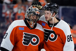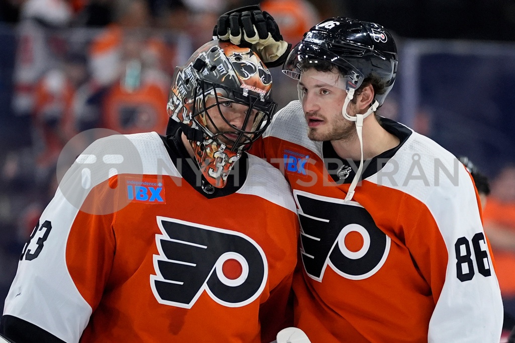 Philadelphia Flyers' Joel Farabee, right, and Samuel Ersson embrace after losing an NHL hockey game against the Washington Capitals, Tuesday, April 16, 2024, in Philadelphia. (AP Photo/Matt Slocum) PXC124