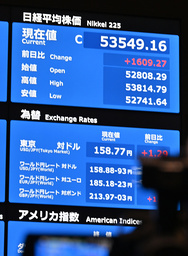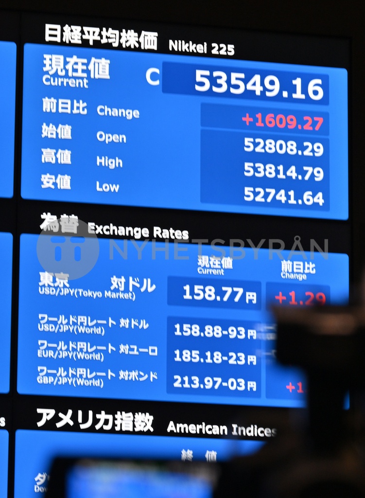Monitors display the closing Nikkei 225 index and foreign exchange rates at the Tokyo Stock Exchange in Tokyo, Tuesday afternoon, Jan. 13, 2026. Japan's benchmark Nikkei 225 finished at a record 53,549, rising above 53,000 for the first time amid buying triggered by media reports that Prime Minister Sanae Takaichi is considering calling a snap general election.