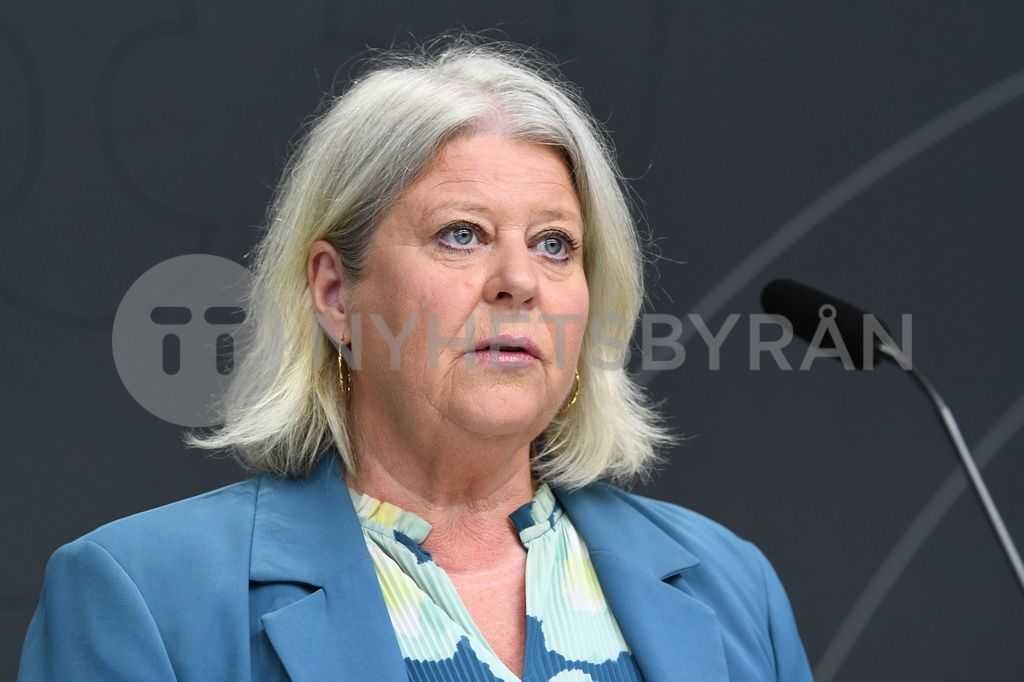 Socialtjänstminister Camilla Waltersson Grönvall (M) tar emot betänkandet från Adoptionskommissionen och den särskilda utredaren Anna Singer, under en pressträff på måndagen.
