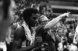 American David Thompson (North Carolina state), high scorer in 75-67 victory over Russia, wears one of the basketball nets around his neck on August 24, 1973 in Moscow. Team manager Duane Woltzen is at right. (AP Photo)