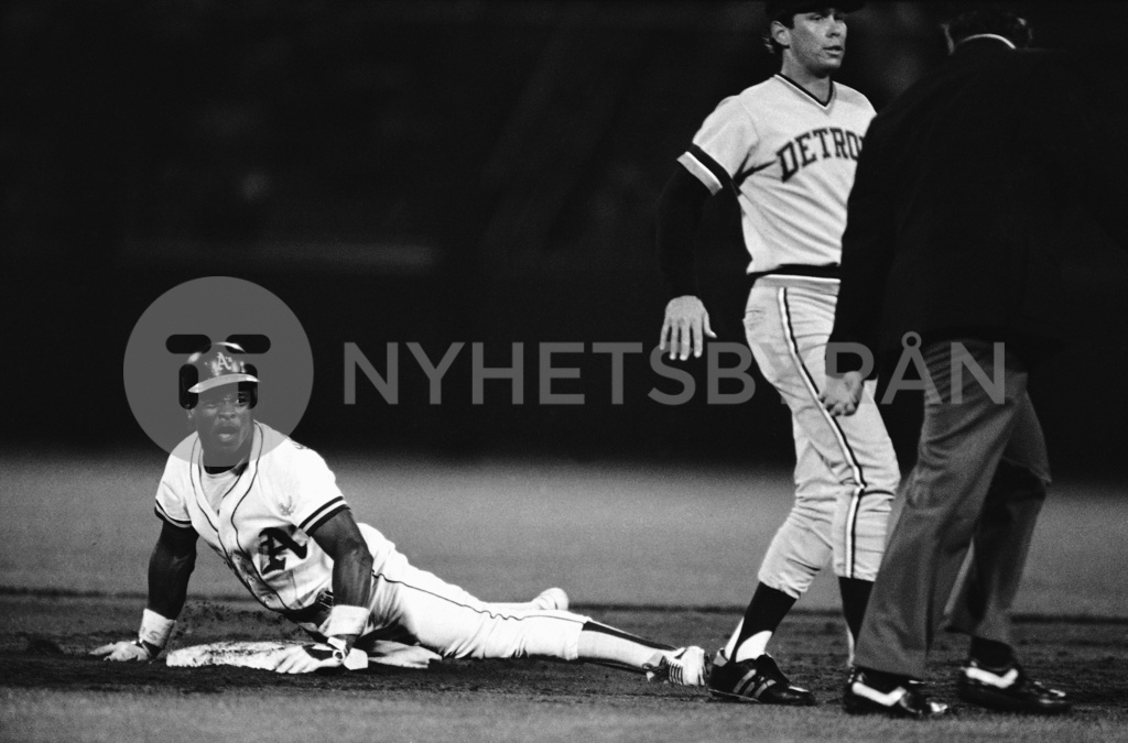 Oakland As Rickey Henderson, left, reacts after getting his 115th stolen base of the season against the Detroit Tigers in the third inning at Oakland Coliseum, Monday, Aug. 24, 1982, Oakland, Calif. He only needs four more stolen bases to beat Lou Brocks record of 118th bases. The As lost the game 5-1. (AP Photo)