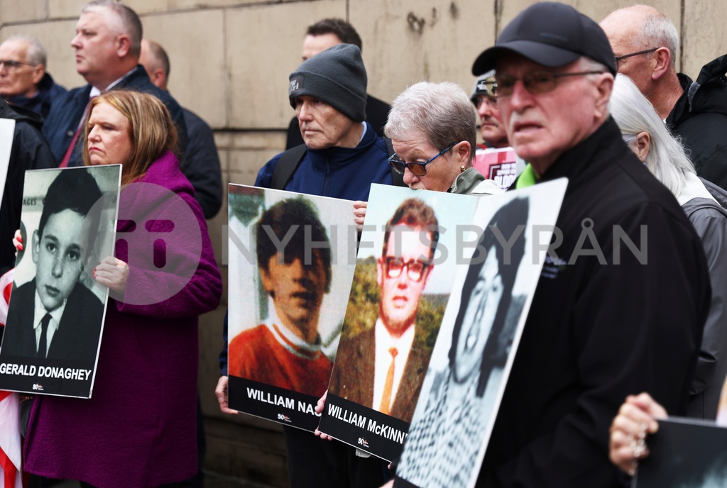 Families of the victims of the 1972 Bloody Sunday, hold a protest outside Belfast Crown court, Northern Ireland, Monday Sept. 15, 2025. (AP Photo/Peter Morrison) XPM102
