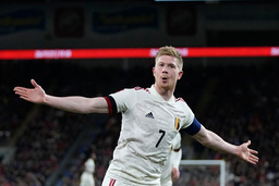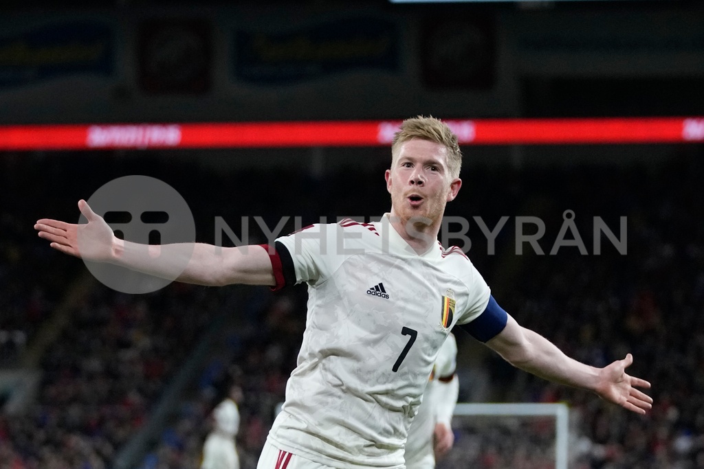 FILE - Belgium's Kevin De Bruyne celebrates after scoring his side's opening goal during the World Cup 2022 group E qualifying soccer match between Wales and Belgium at Cardiff City stadium in Cardiff, Wales, Tuesday, Nov. 16, 2021. (AP Photo/Frank Augstein, File) FP103