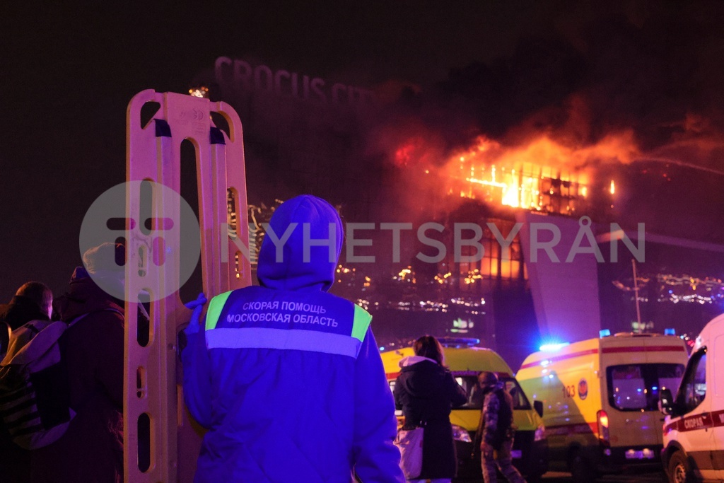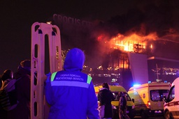 A medic stands near ambulances parked outside the burning building of the Crocus City Hall on the western edge of Moscow, Russia, Friday, March 22, 2024. Several gunmen have burst into a big concert hall in Moscow and fired automatic weapons at the crowd, injuring an unspecified number of people and setting a massive blaze in an apparent terror attack days after President Vladimir Putin cemented his grip on the country in a highly orchestrated electoral landslide. (AP Photo/Vitaly Smolnikov) XAZ130