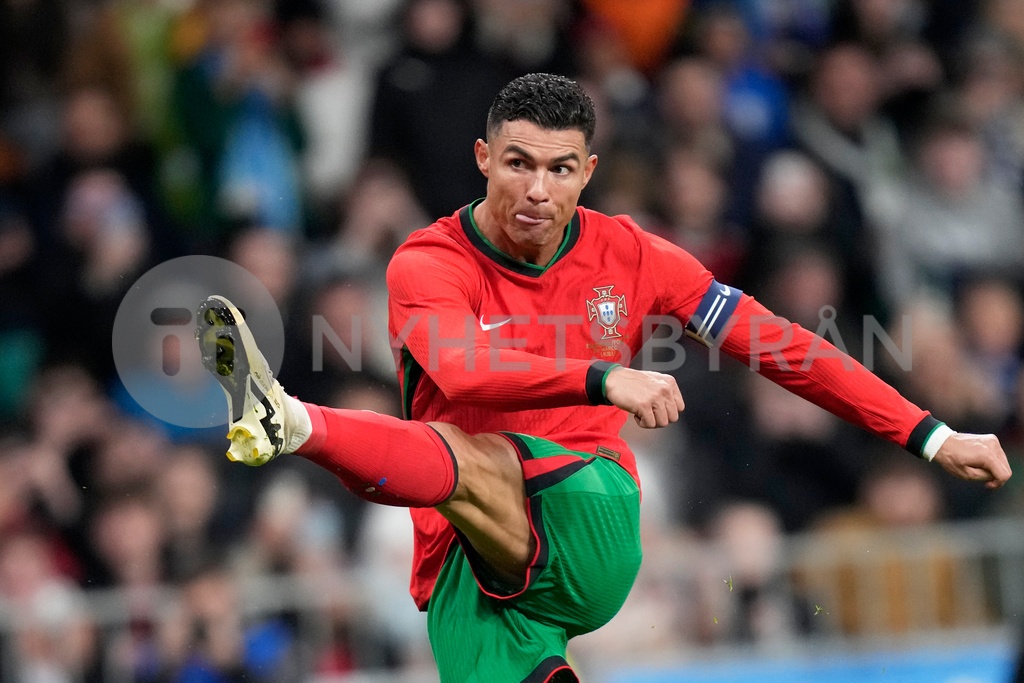FILE - Portugal's Cristiano Ronaldo attempts a shot at goal during the international friendly soccer match between Slovenia and Portugal at the Stozice stadium in Ljubljana, Slovenia, Tuesday, March 26, 2024. The 24-team lineup is complete and all roads now lead to Germany for the European Championship. (AP Photo/Darko Bandic), File) EUR104
