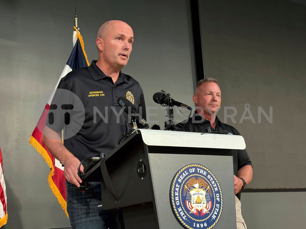 Utah Gov. Spencer Cox, left, speaks with Utah Valley University Chief of Police Jeff Long, right, at the Keller Building on the Utah Valley University campus after Charlie Kirk was shot and died during Turning Point's visit to the university, Wednesday, Sept. 10, 2025, in Orem, Utah. (AP Photo/Hannah Schoenbaum) RPHS407