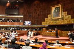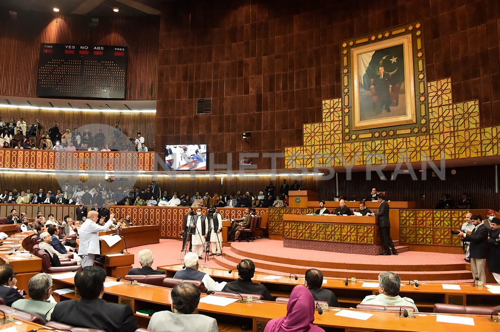 In this photo released by National Assembly of Pakistan, newly elected Pakistani Prime Minister Shahbaz Sharif, lower left, addresses during a session of the National Assembly, in Islamabad, Pakistan, Monday, April 11, 2022. Pakistan's parliament elected opposition lawmaker Sharif as the new prime minister Monday, following a week of political turmoil that led to the weekend ouster of Premier Imran Khan. (National Assembly of Pakistan via AP) ISL103
