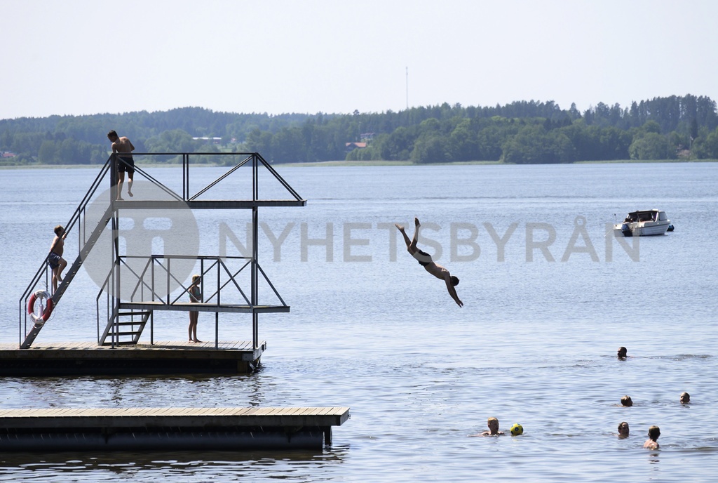 ENKÖPING 20210619 Killar hoppar från ett hopptorn ner i det svalkande vattnet i sommarvärmen vid badplatsen Bredsand vid Mälaren Foto Fredrik Sandberg / TT kod 10080