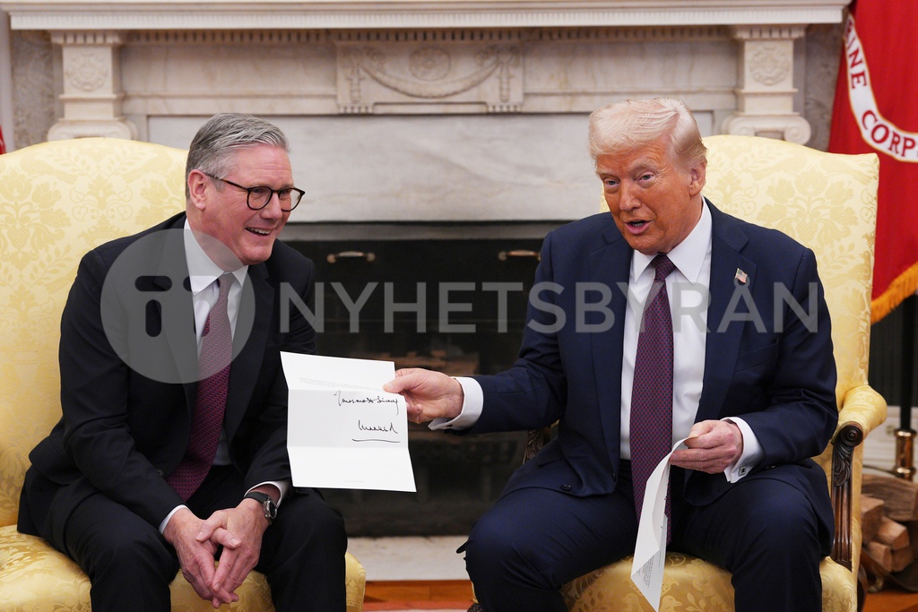 British Prime Minister Keir Starmer, left, hands an invitation from King Charles III to President Donald Trump at the White House, Thursday, Feb. 27, 2025, in Washington. (Carl Court/Pool via AP) lbj107