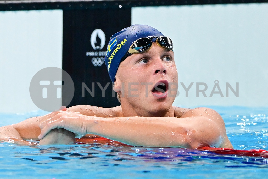 Victor Johansson (i Sarah Sjöströms mössa) simmar försök på 1500 meter fritt i La Defense Arena under sommar-OS i Paris.