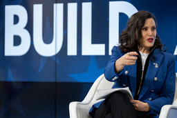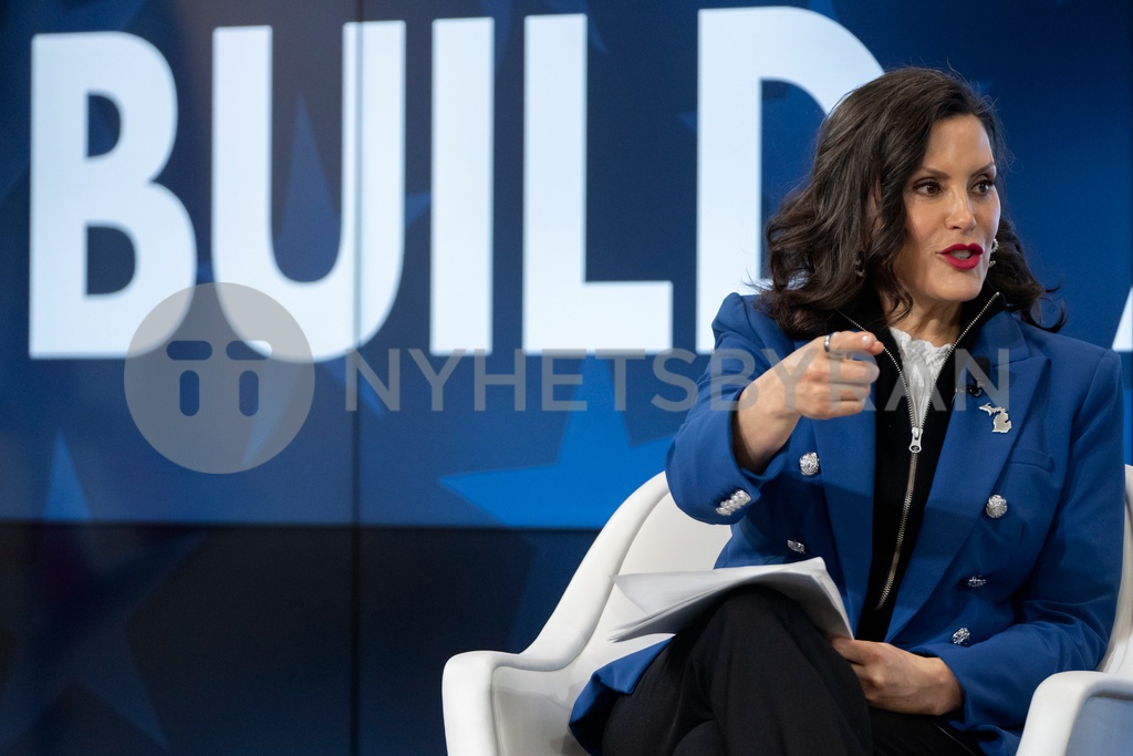 Michigan Gov. Gretchen Whitmer speaks with former television journalist Gretchen Carlson, not shown, at an event on Wednesday, April 9, 2025, in Washington. (AP Photo/Mark Schiefelbein) DCMS105