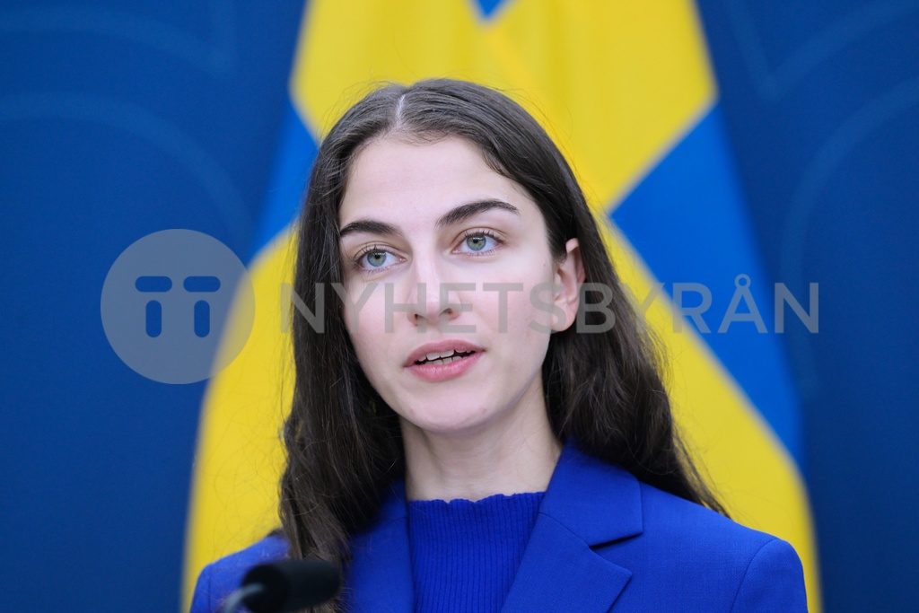 STOCKHOLM, SVERIGE 20231114 Klimat- och miljöminister Romina Pourmokhtari (L) under en pressträff med tidöpartierna om klimatpolitik på Rosenbad. Foto: Fredrik Sandberg / TT / Kod 10080