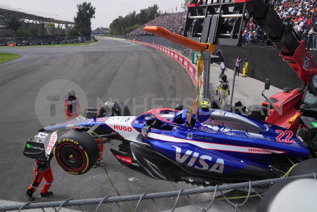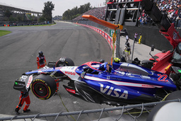 RB driver Yuki Tsunoda of Japan's car is removed from the track by marshals after crashing during the Formula One Mexico Grand Prix auto race at the Hermanos Rodriguez racetrack in Mexico City, Sunday, Oct. 27, 2024. (AP Photo/Fernando Llano) XAP139