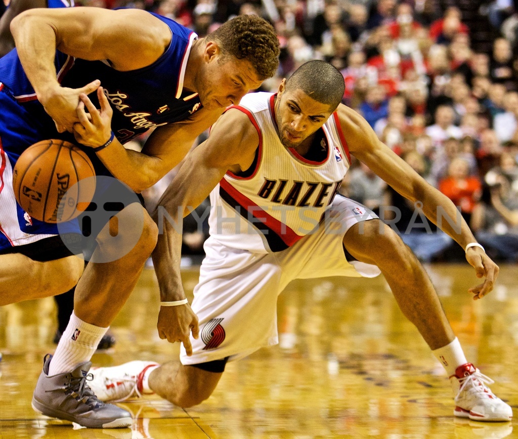 Dec 26, 2013; Portland, OR, USA; Los Angeles Clippers power forward Blake Griffin (32) and Portland Trail Blazers small forward Nicolas Batum (88) go after a loose ball at the Moda Center. Mandatory Credit: Craig Mitchelldyer-USA TODAY Sports