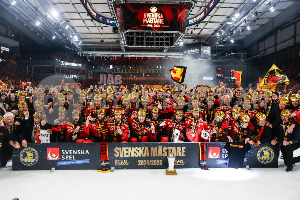 Luleåspelarna jublar med bucklan efter segern i torsdagens final 6 i bäst av 7 i SM-slutspelet i SHL mellan Luleå HF och Brynäs IF i Coop Norrbotten arena. Luleå vinner därmed SM-guld efter 5–2 i den sjätte finalen.