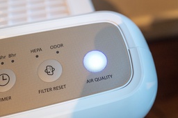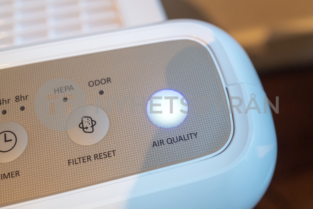 Close-up of air quality indicator light on Coway Mighty HEPA air purifier in domestic room, Lafayette, California, September 15, 2021. (Photo by Smith Collection/Gado/Sipa USA)