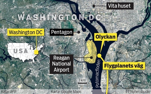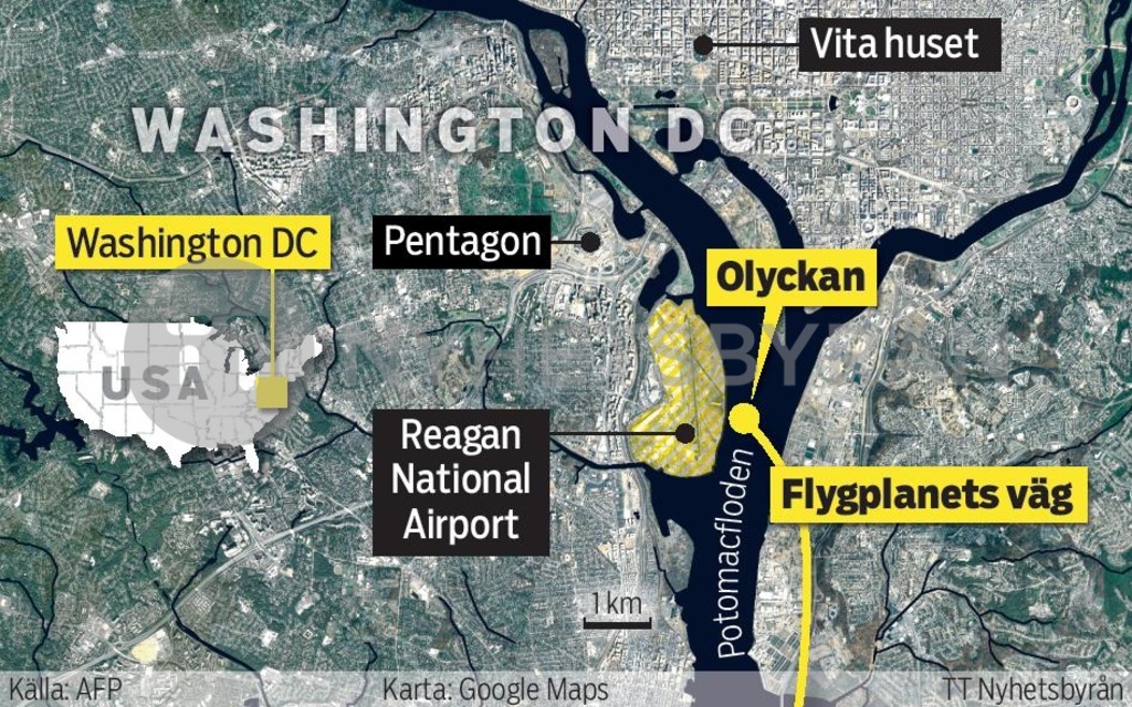 Kartan visar flygplanets väg in mot flygplatsen i Washington DC samt den plats över Potomac-floden där det kolliderade med en Black Hawk-helikopter.