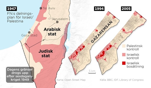 FN:s delningsplan för Israel/ Palestina från 1947 samt kartor över Gazaremsan som visar Israeliska bosättningar 1994 och 2005.