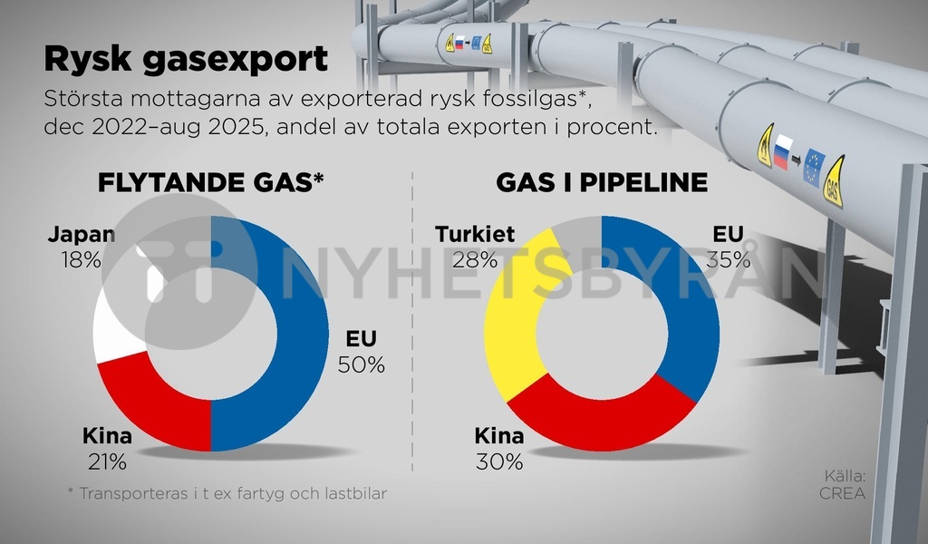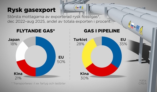 Största mottagarna av exporterad rysk fossilgas, december 2022–augusti 2025, andel av totala exporten i procent.